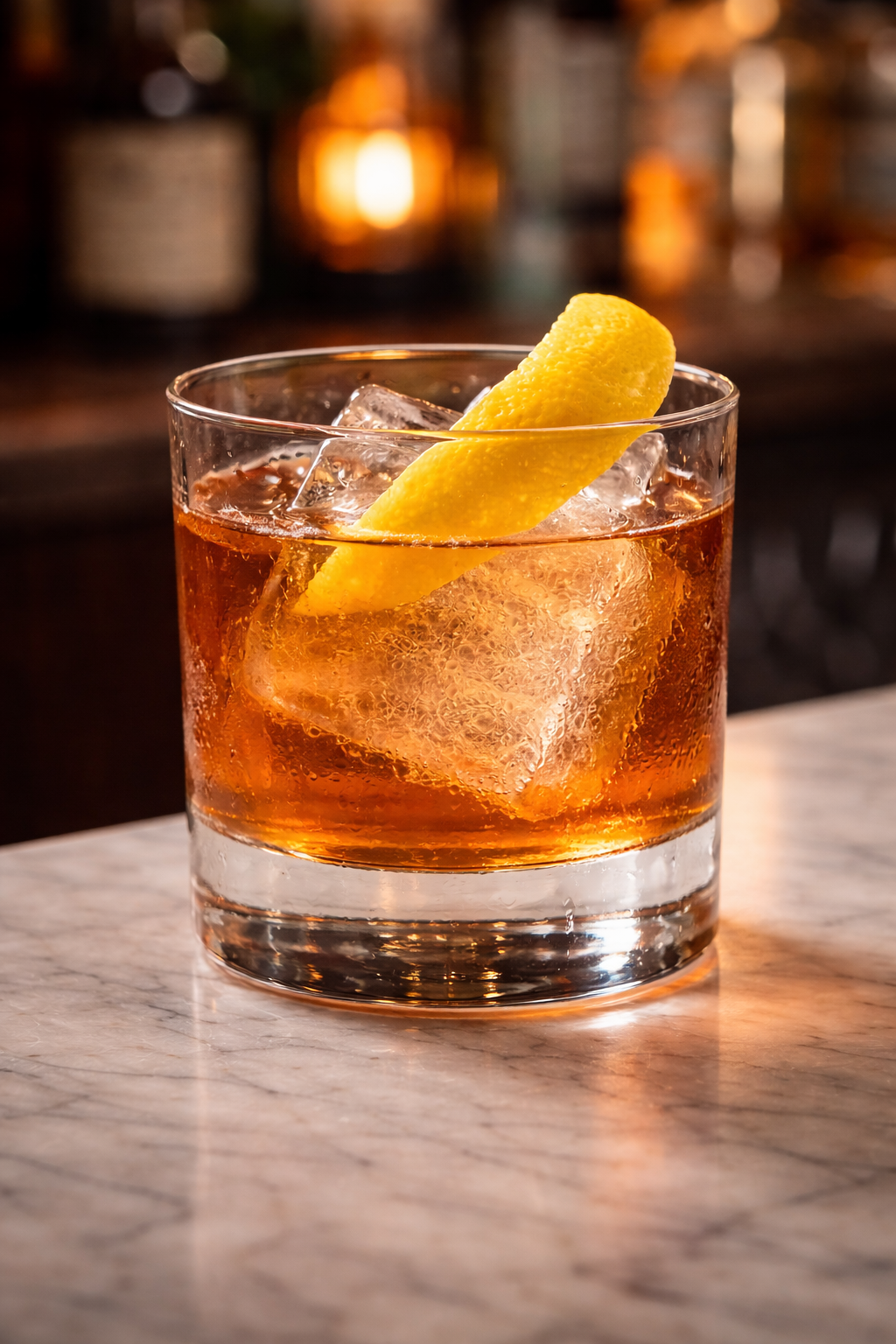 Vaso: Old Fashioned / rocks | Hielo: Cubo | Decoración: twist de limón | Técnica: directo al vaso y remover